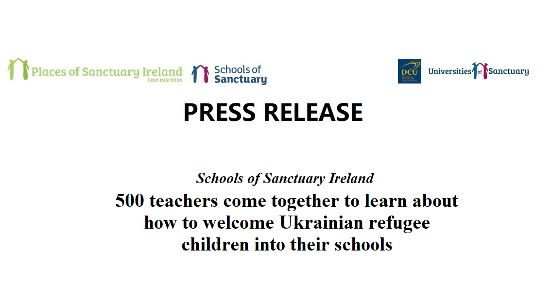 500 teachers from all over the country came together yesterday (23rd March) for a webinar on how to welcome refugee children – and particularly refugee children from Ukraine – into Irish schools. The webinar was organised jointly by Dublin City University and Schools of Sanctuary Ireland, an initiative of Places of Sanctuary Ireland, the all-island network of groups set up in 2016 whose aim is to create a culture of welcome, safety and inclusion for refugees, asylum seekers and other vulnerable migrants.